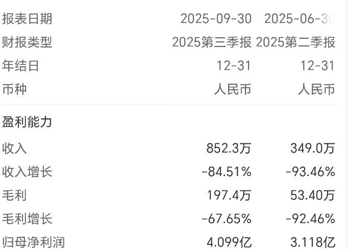 其中,二季度收入349万元,归母净利润3.118亿元,三季度收入852.3万元,归母净利润4.099亿元。